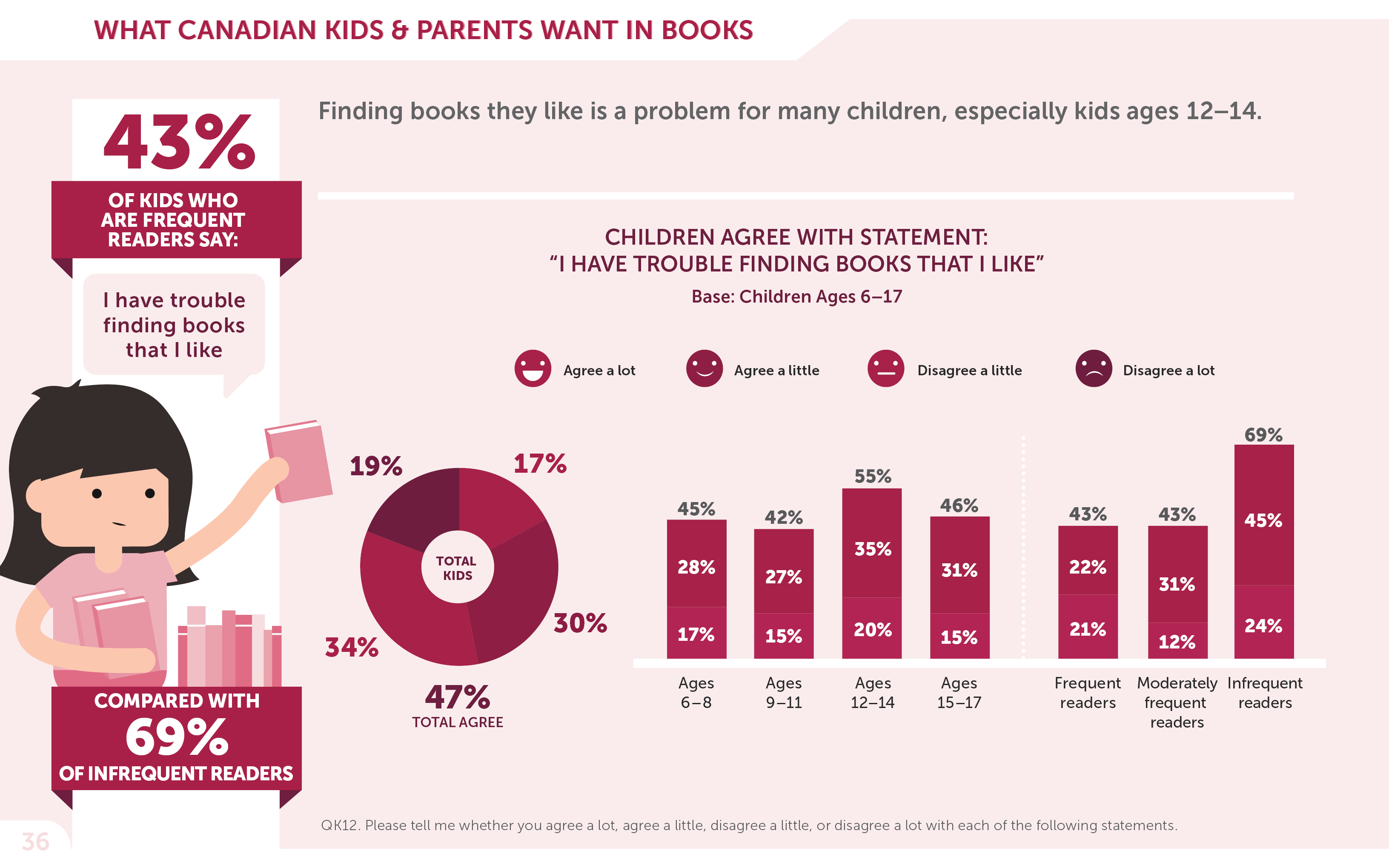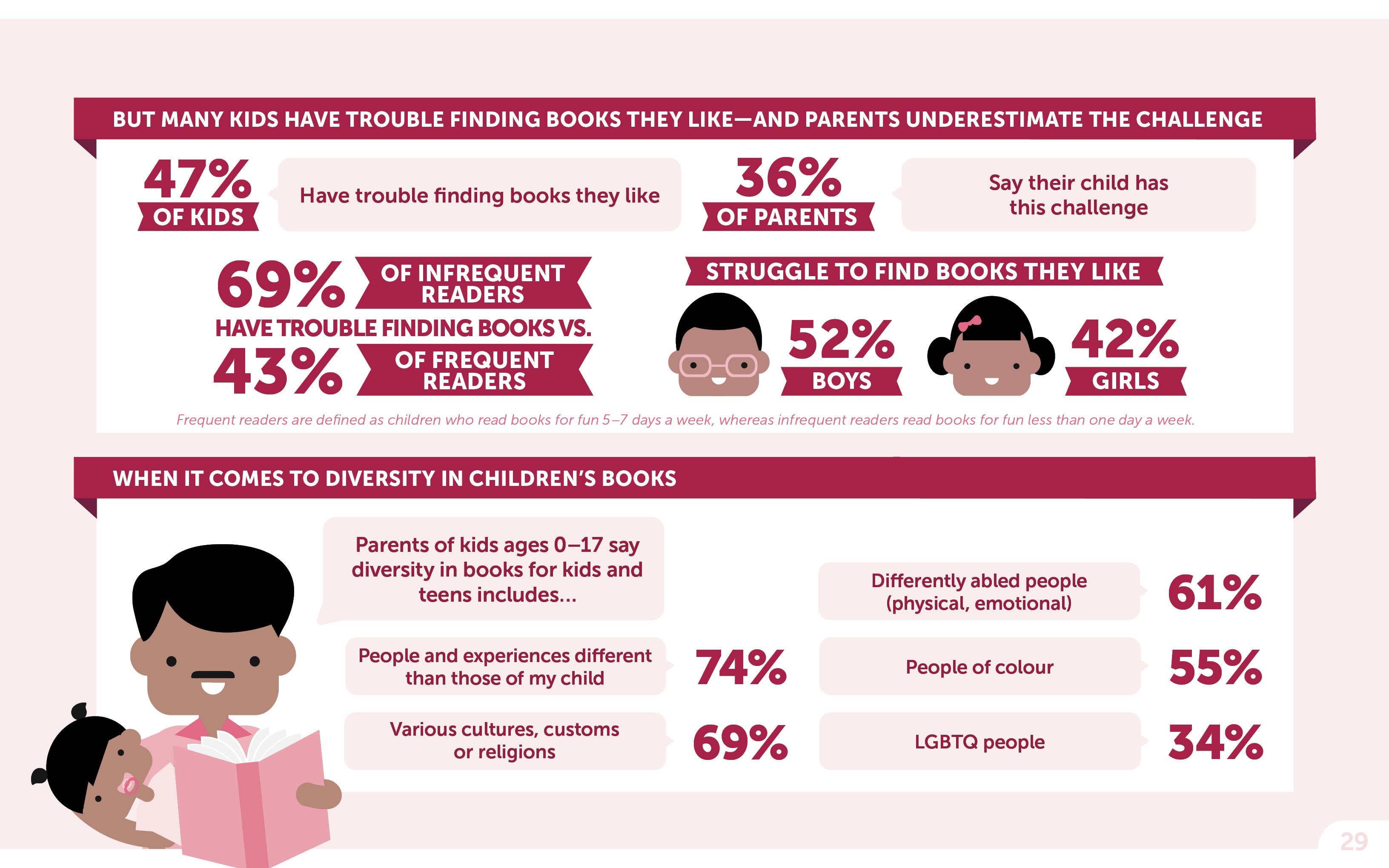 47% of kids say that they have trouble finding books they like, whereas only 36% of parents report that their child has this challenge.