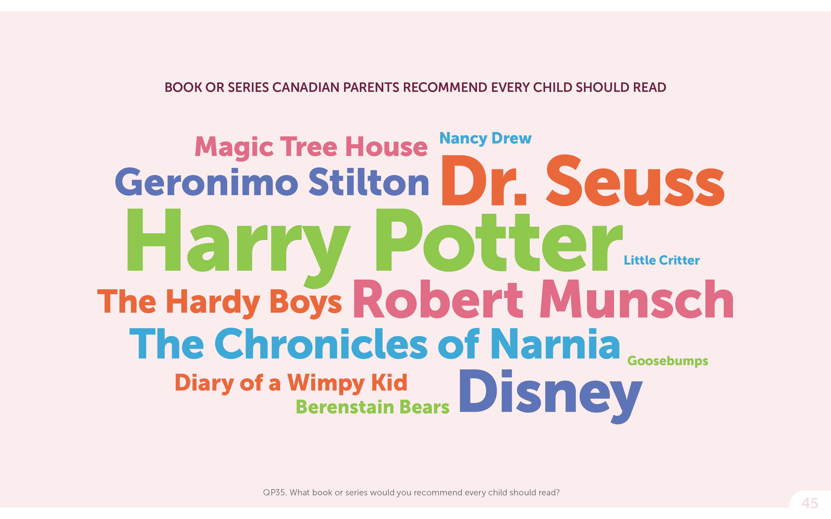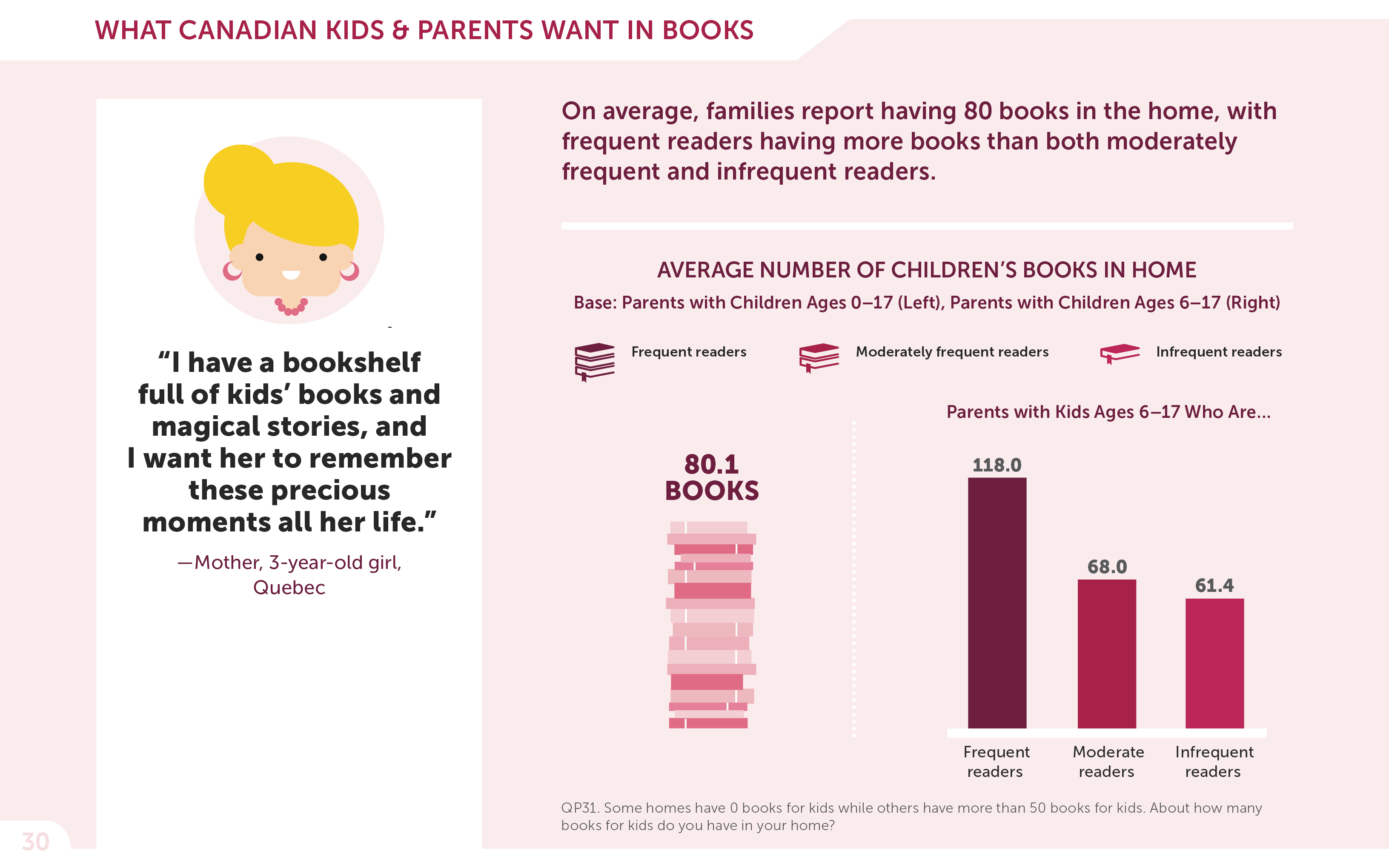 An open ended response from a Mother of a 3 year old girl from Quebec on the importance of books: "I have a bookshelf full of kids' books and magical stories, and I want her to remember these precious moments all her life."