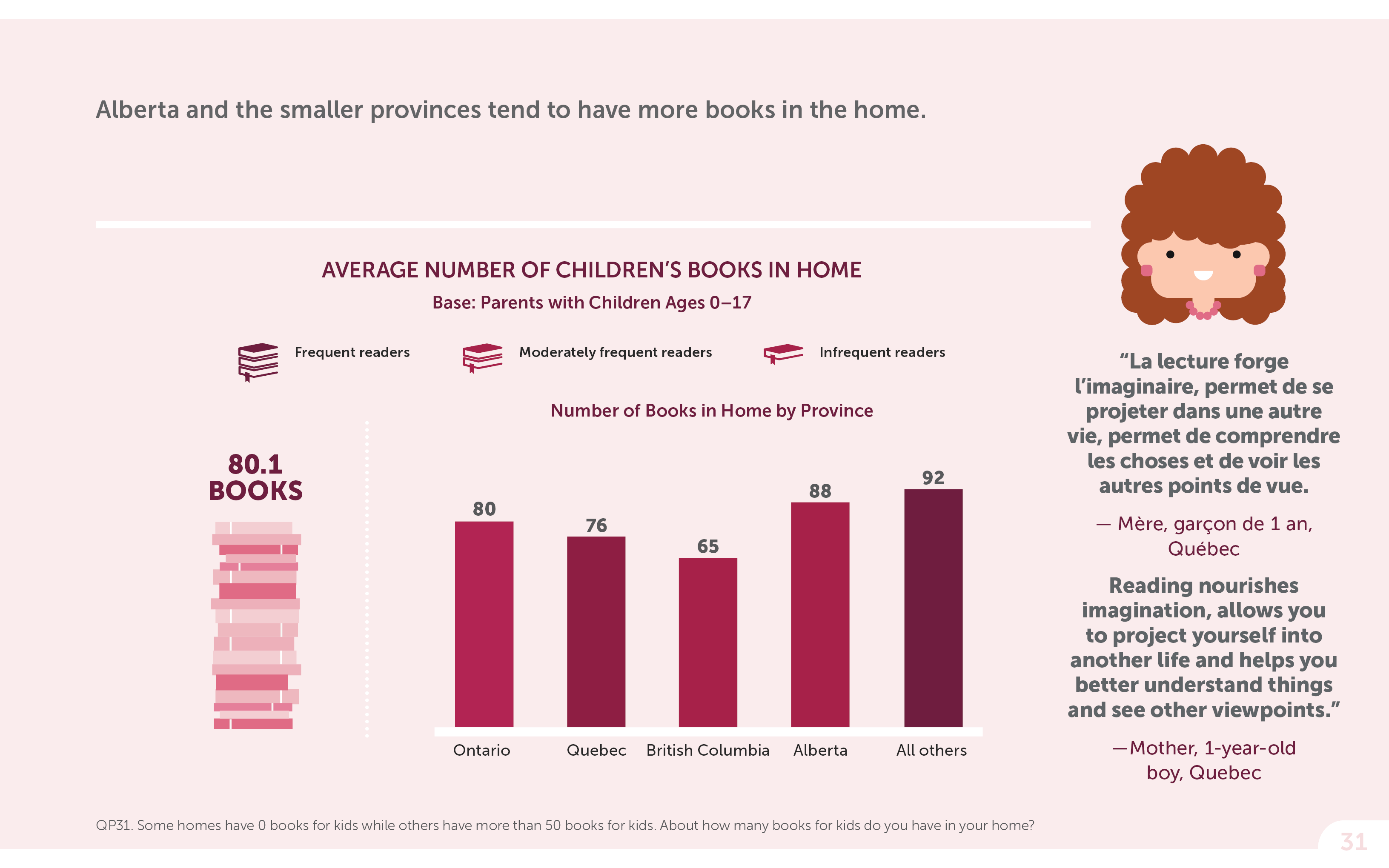 "La lecture forge l'imaginaire, permet de se projeter dans une autre vie, permet de comprendre les choses et de voir les autres points de vue"- Mere, garcon de 1 an, Quebec