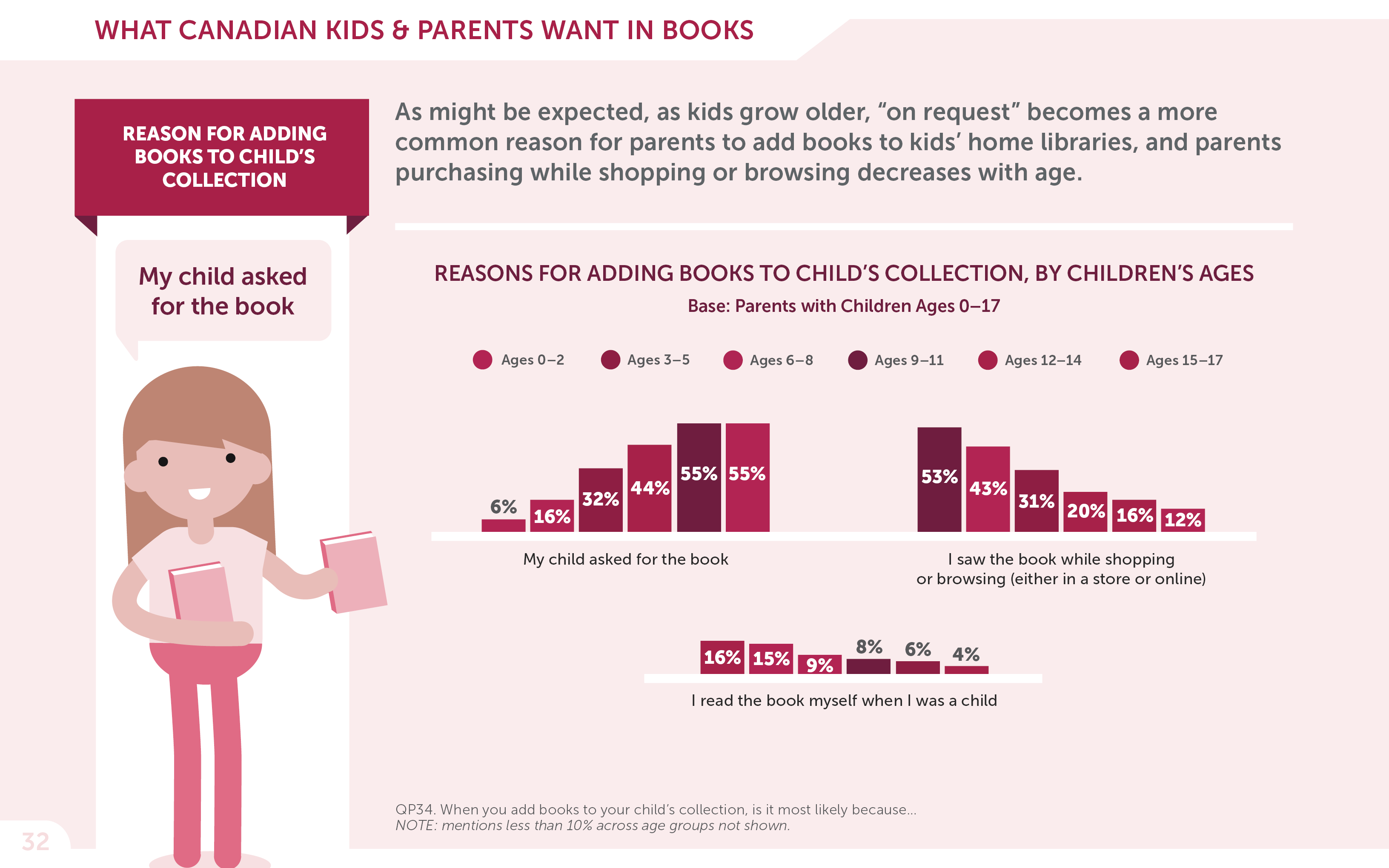 Parents of children ages 3-5 responded that they would most likely buy a book because their child asked for it 16% of the time, that they would most likely buy a book because they saw it while shopping or browsing (either at a store or online) 43% of the time, and that they would most likely buy a book because they read it themselves as children 15% of the time.