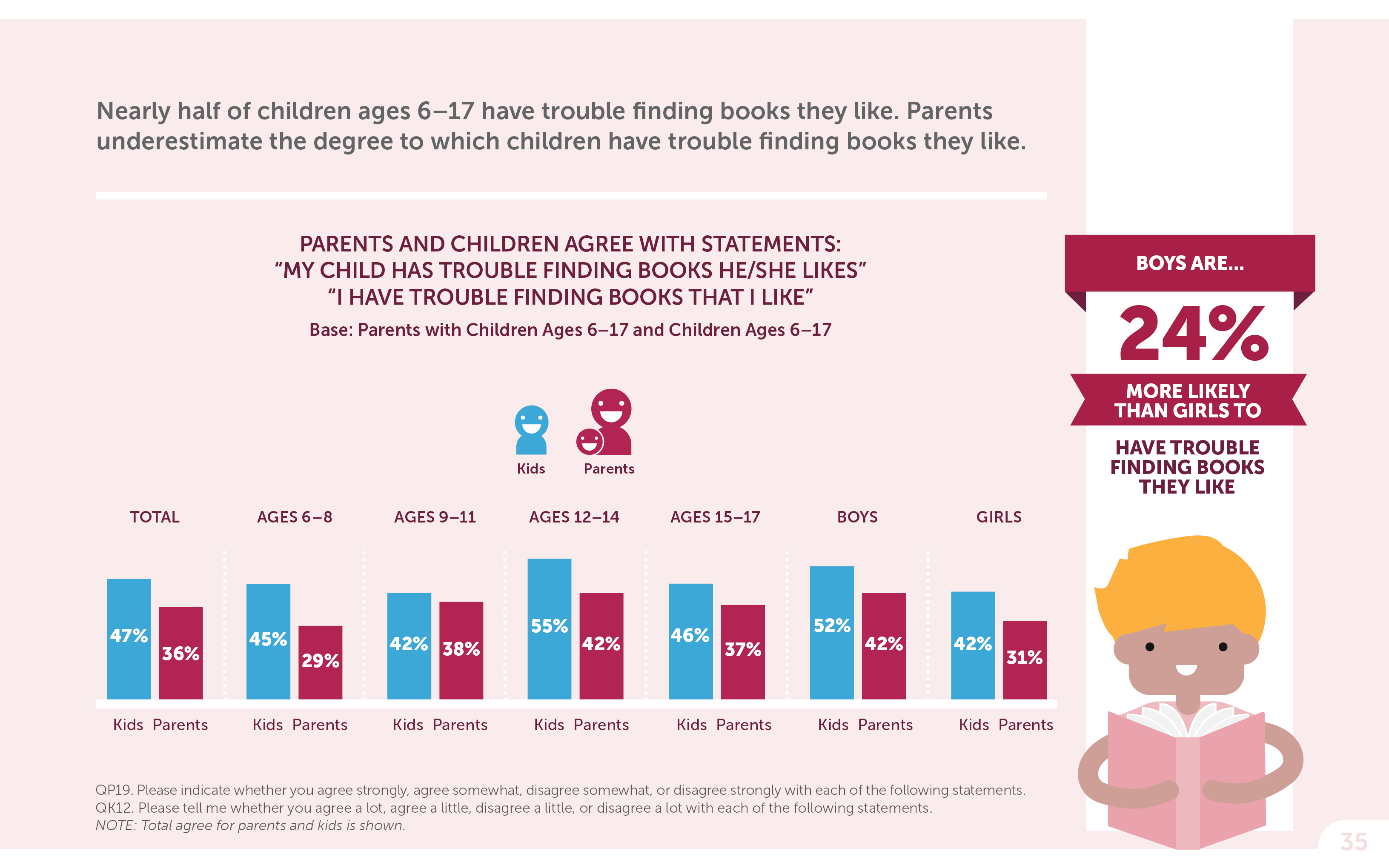 Nearly half of children ages 6-17 have trouble finding books they like. Parents underestimate the degree to which children have trouble finding books they like.