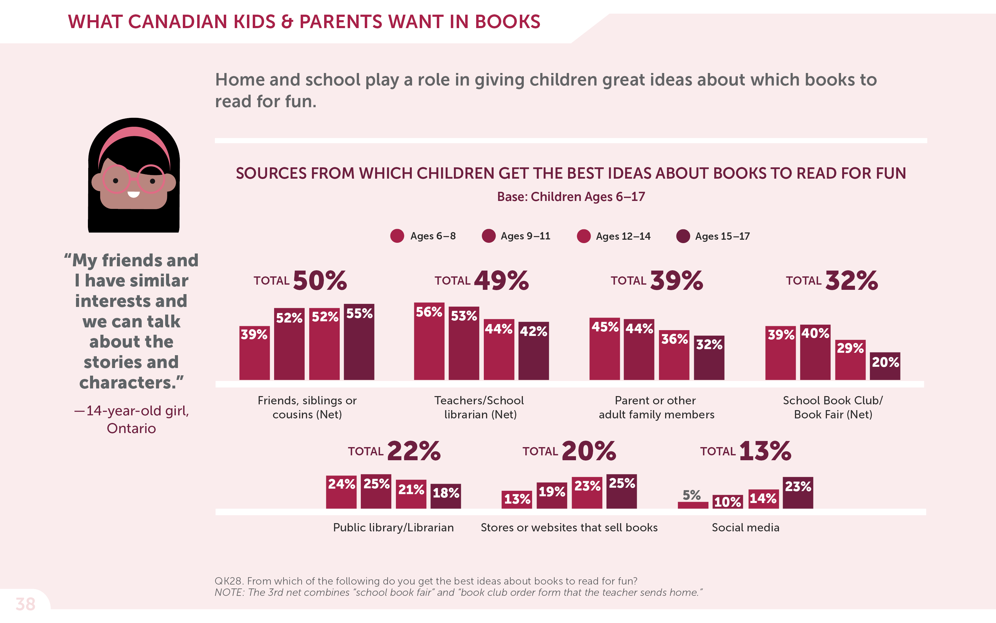 For all kids interviewed of any age, a total of 50% said that their best ideas from friends, siblings or cousins, 49% said teachers/school librarians, 39% said parents or other adult family members, 32% said school book clubs/fairs, 22% said public libraries/librarians, 20% said stores or websites that sell books, and 13% said social media.