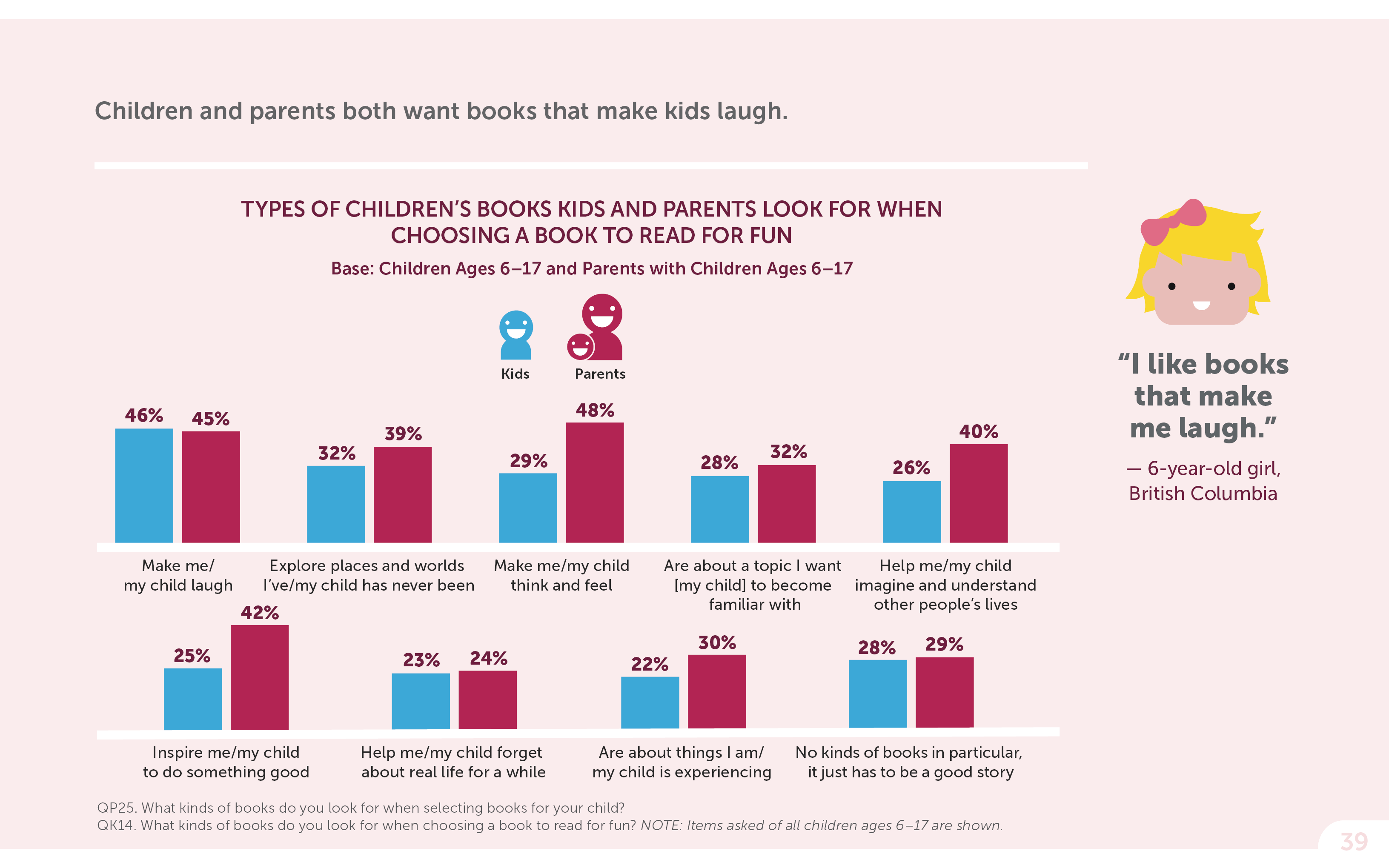 46% of kids, and 45% of parents said that they look for books that make them/ their child laugh.