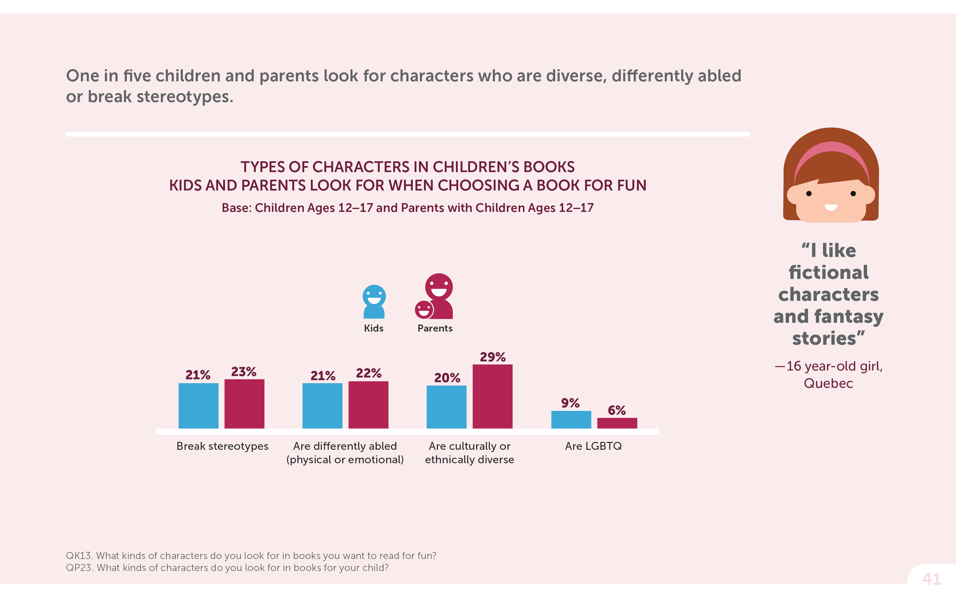 26% of kids and 40% of parents said that they look for books that help them/ their child imagine and understand other people's lives.