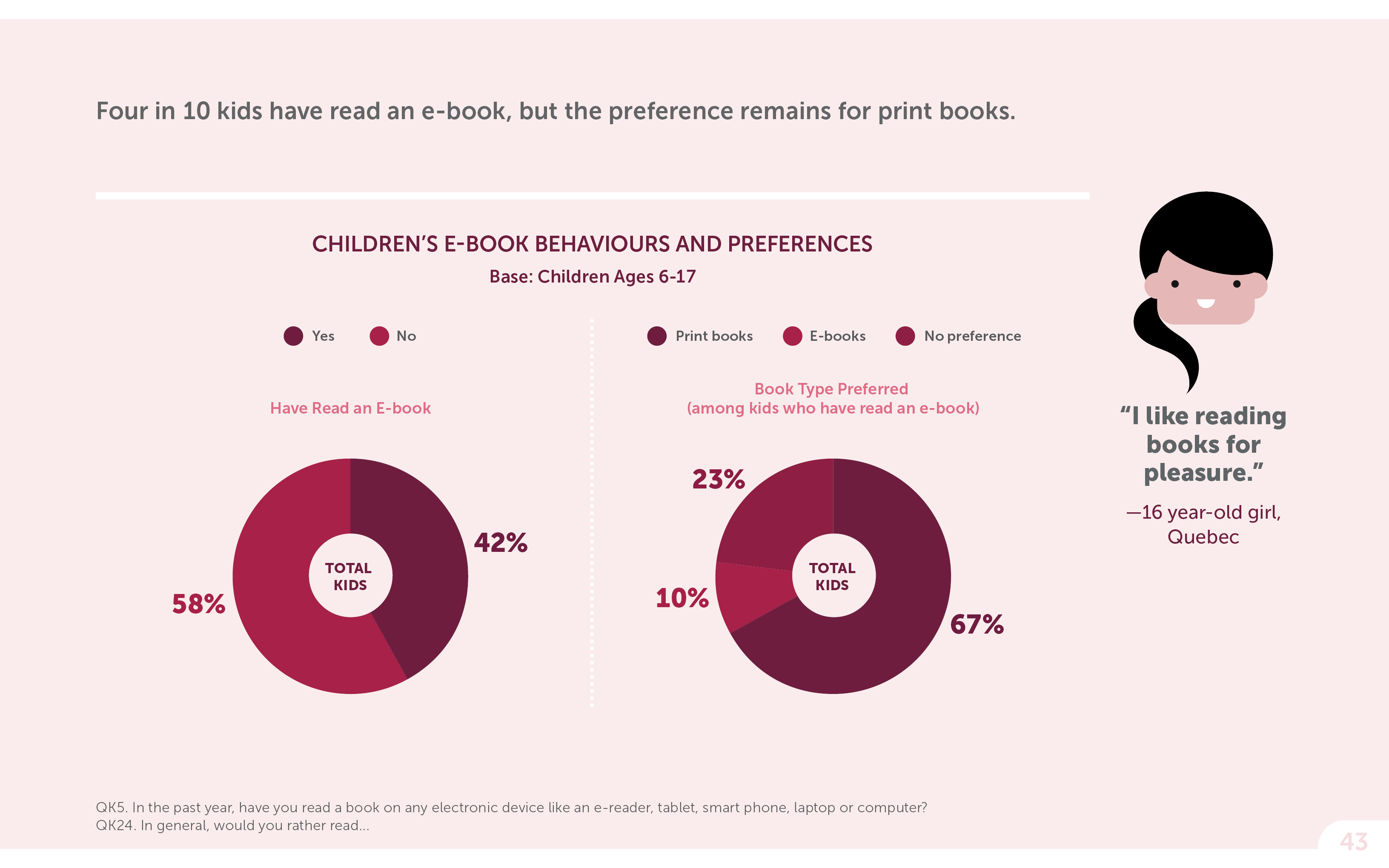 In total, 67% of kids expressed a preference for print books, 10% expressed a preference for e-books, and 23% had no preference either way.
